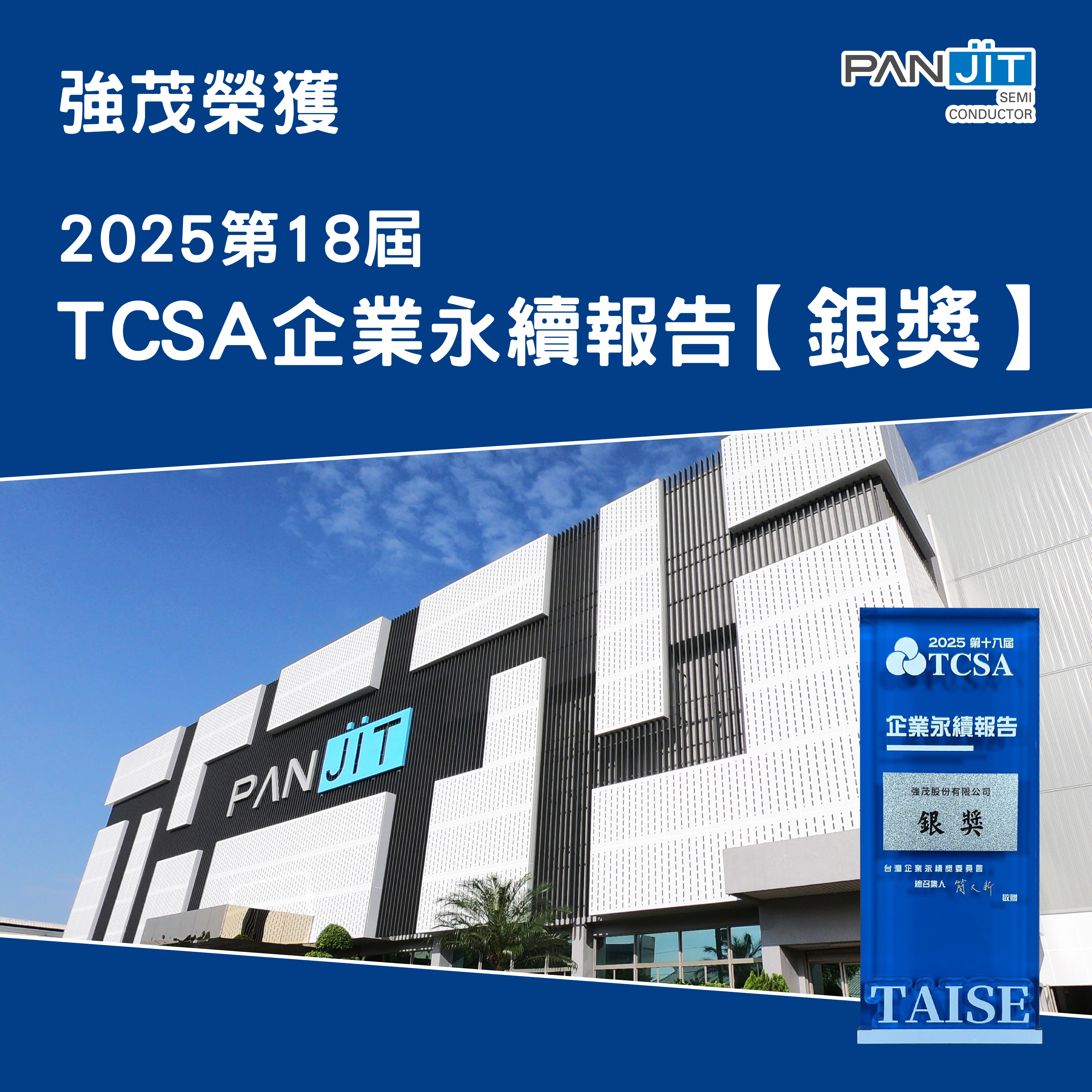 PANJIT International Inc. (“PANJIT”) was honored at the 18th Taiwan 强茂股份有限公司(以下简称“强茂”)在 2025 年第十八届“TCSA 台湾企业永续奖评选中,凭借其永续报告书在信息披露完整性、ESG 战略架构及执行成效方面的优异表现,荣获 电子信息制造业—第一类 永续报告书“银级奖”,充分展现了公司在永续治理与企业社会责任领域的持续深耕与实践成果。