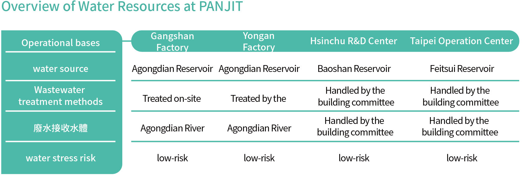 The main water use at PANJIT is tap water. Water intake is compliant with local regulations and does not cause major environmental impact. The water resource stress risk where the plant is located is assessed in accordance with the World Resources Institute’s (WRI) Aqueduct Water Risk Atlas, and the results show that PANJIT is in “low-risk” areas. The company will also continue to pay attention to the water resource risks for timely establishment of the corresponding strategies.