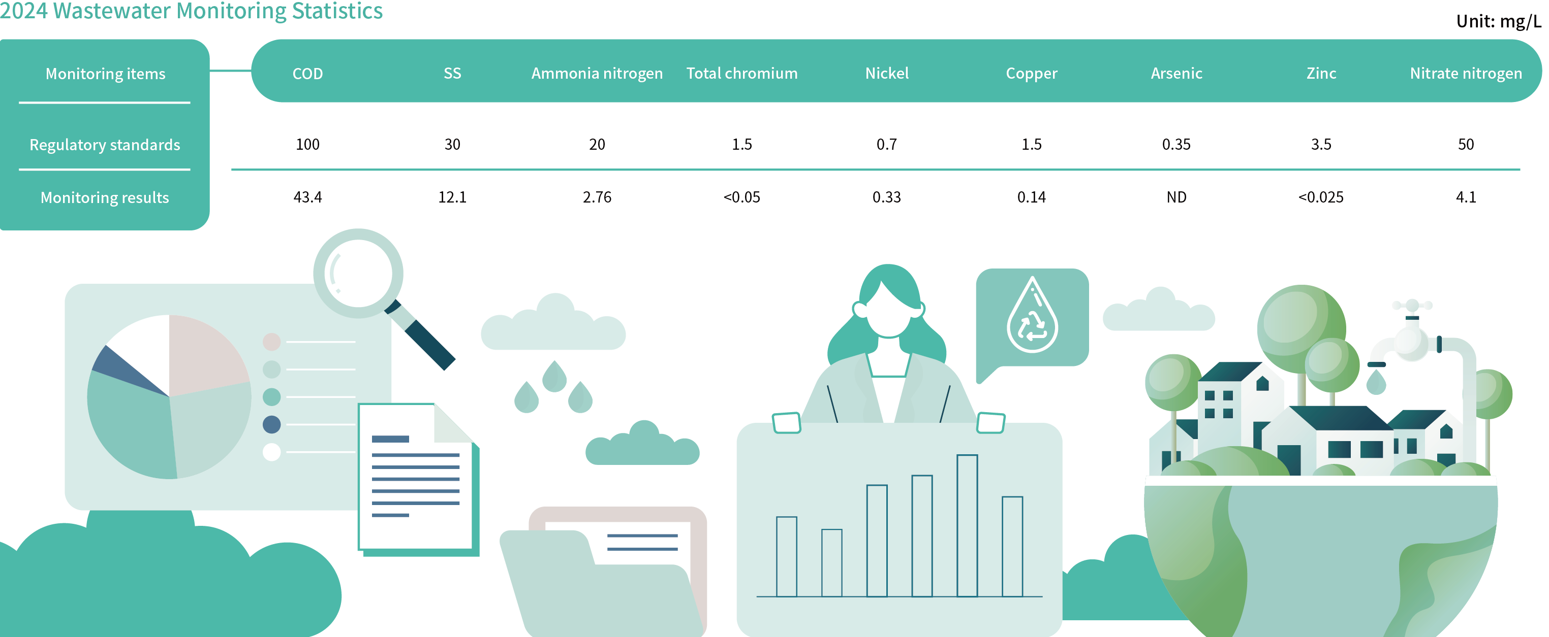 Wastewater at PANJIT mainly includes process wastewater and domestic sewage, which are treated onsite before being discharged, and is also diverted and managed separately in accordance with the drainage characteristics. This not only helps increase the recovery rate of water but also reduce the dosage used for water treatment that will lessen the difficulty of back-end wastewater treatment and environmental load due to the fact that some waste acid liquid and organic waste liquid still have its economic value after recovery. The treated sewage is discharged into the sewers in accordance with regulations. The company entrusted manufacturers to conduct water quality testing on a regular basis, and the results also show the treatment is compliant with legal requirements and there is no major impact on local water bodies.