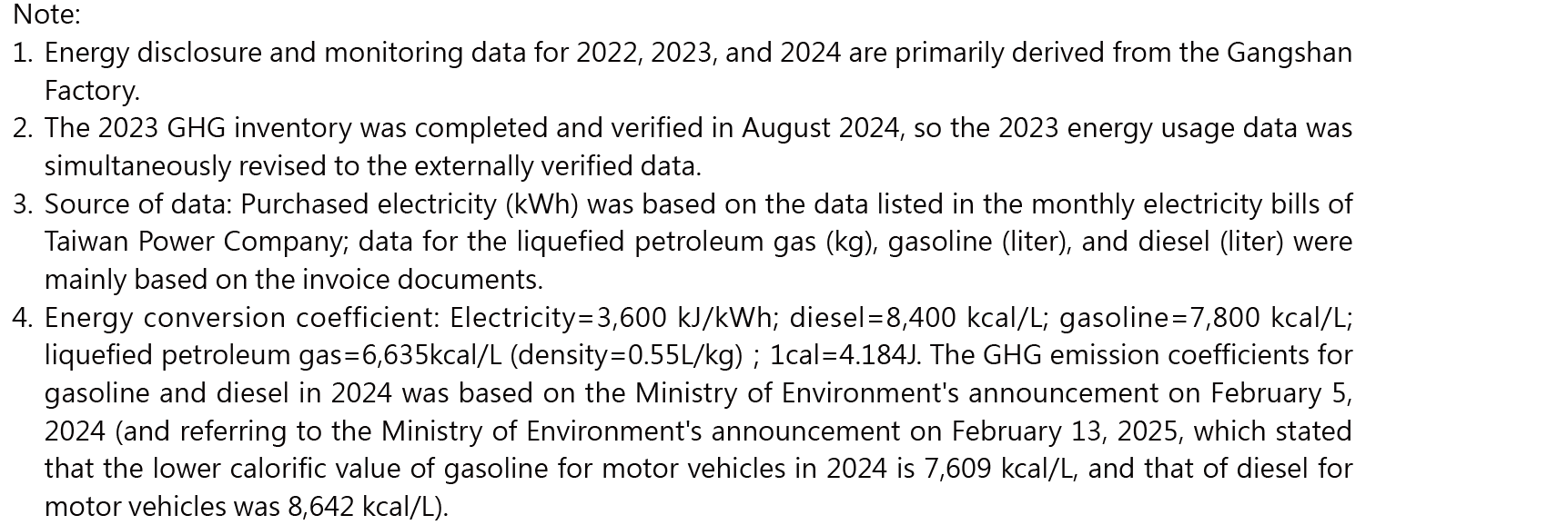 The energy consumption at Gangshan Factory includes purchased electricity, gasoline, diesel, and liquefied petroleum gas (LPG), among which, purchased electricity is the major energy used, accounting for 99.60% of total energy use, which is used for process power, air compressors and other electrical facilities. The remaining energy consumption is used for company cars, forklifts and cafeterias. The total energy consumption of the Gangshan Factory in 2024 was 173,228.13 GJ. To effectively manage energy use and improve energy performance, PANJIT has introduced ISO 5001 in October, 2022, and passed the verification in 2023 and 2024, showing the stability and effectiveness of the energy management system. To meet regulatory requirements, we have completed the installation of electricity and flow meters on critical energy-consuming systems, along with the deployment of real-time energy monitoring platform to drive greater efficiency and more accurate energy management.