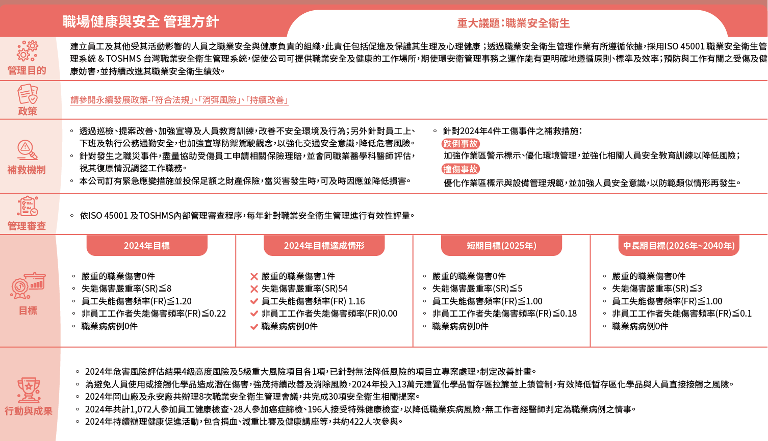 在身心障碍员工及原住民员工聘雇方面,本公司均依据《身心障碍者权益保障法》招募及聘用,针对未足额部分除依法令规定向劳工主管机关缴纳身心障碍者就业基金差额补助费外,还拟定预防改善措施,2024 年聘用身心障碍员工人数12 人(0.8 %)、原住民员工人数1 人(0.1%)。