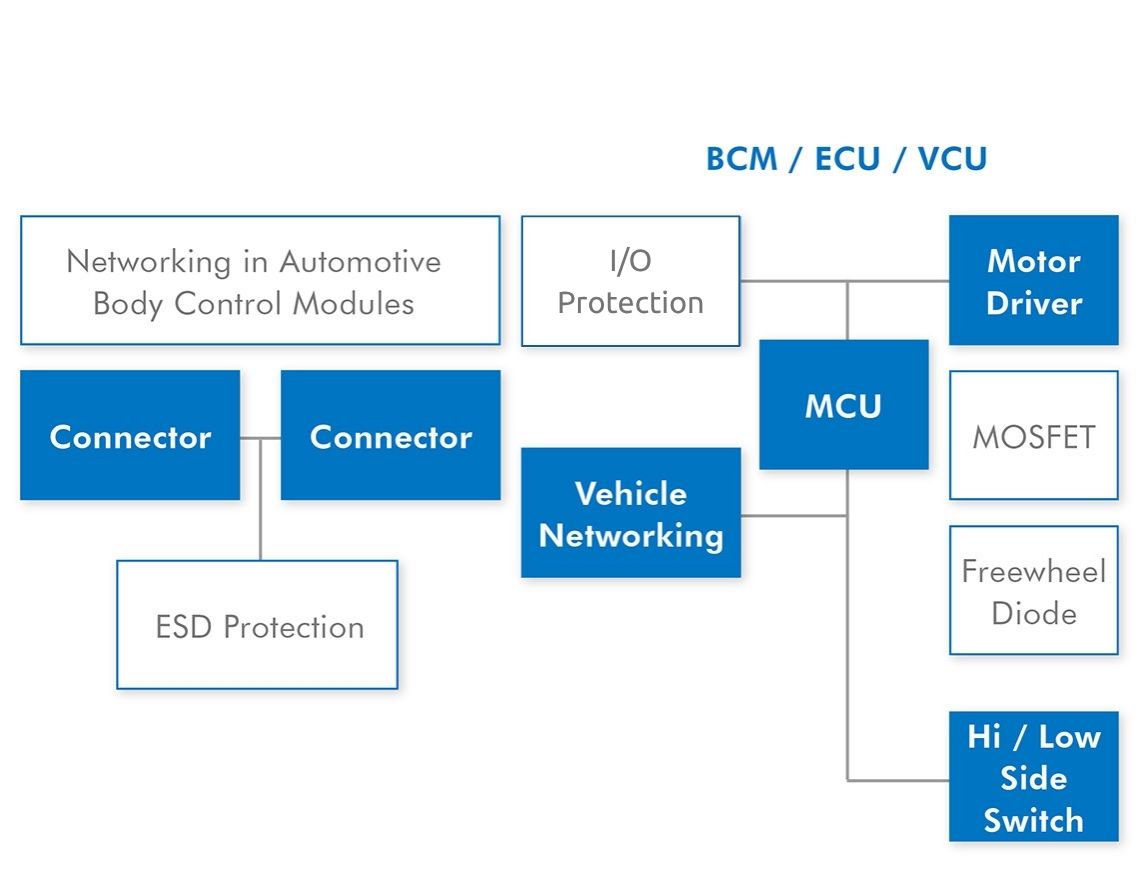 The automotive body and comfort applications are constantly being upgraded in order to improve drivers' and passengers' driving experience. The audio-visual system, which includes wipers, navigation, heads-up display, surround view parking assist system (AVM), parking sensors, etc., is designed to improve drivers' grasp of the surrounding environment and driving safety. Seating memory and heating, ventilation, and air conditioning (HVAC) reduce driving fatigue. In-vehicle infotainment systems are gradually being connected to the Internet of Things (IoT), increasing the passenger experience. PANJIT provides a range of innovative solutions for automotive body applications and in-vehicle infotainment systems, such as ESD protection devices to protect information transmission on the LIN bus and CAN bus, or H-type Schottky and MOSFET components for power circuits.