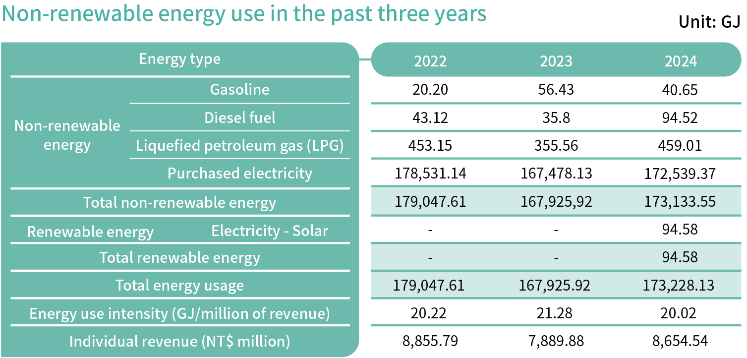 In addition, the Company installed solar panels in the plant. In 2024, the solar installation capacity reached 183.89kW in 2024, generating a total of 181,876.55 kWh (about 654.75 GJ) of electricity, and 154.63 kW of capacity was sold in bulk to Taiwan Power Company. The 29.26 kW capacity is for self-consumption, with a total generation of 26,272.55kWh (about 94.58GJ). In the future, the Company will continue to raise the proportion of renewable energy use to achieve effective reduction of carbon emissions.