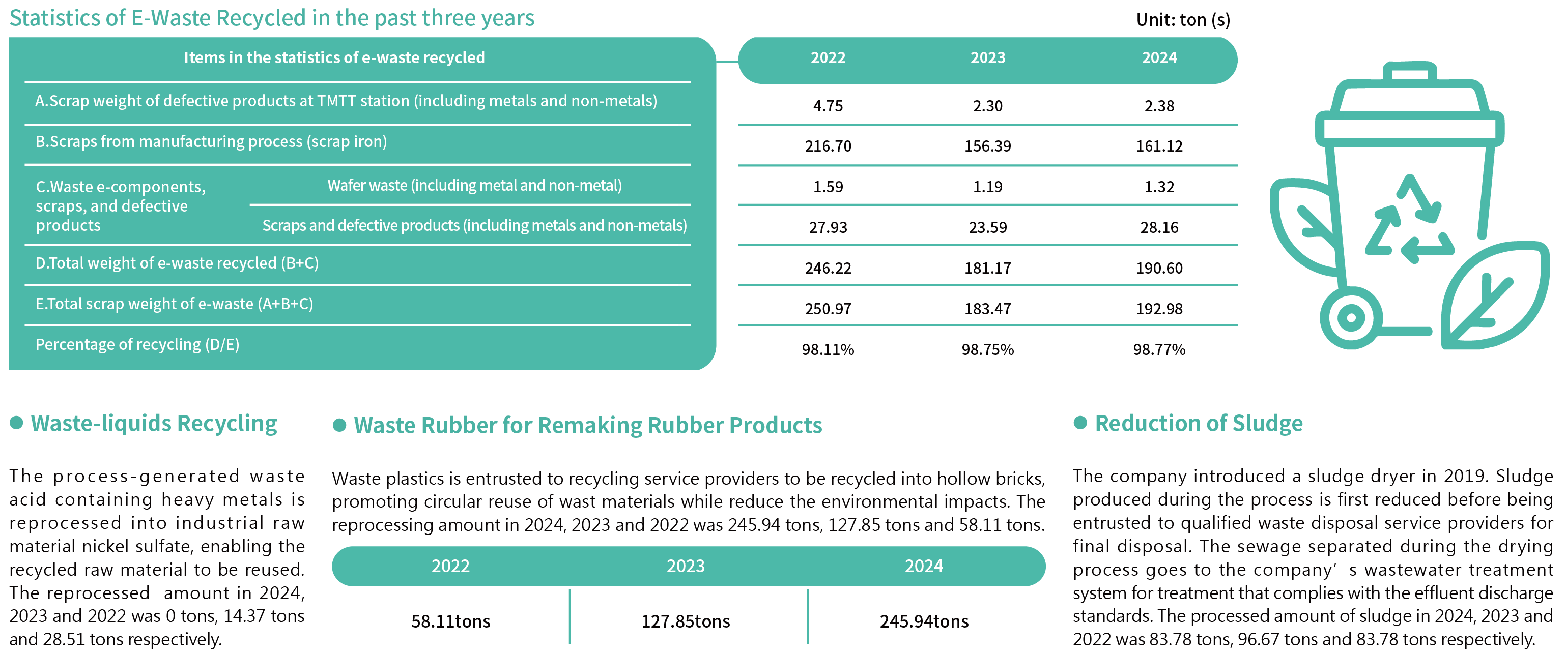 The total waste generated in Gangshan Factory and Yongan Factory totaled 844.54 metric tons in 2024, of which 757.21 metric tons (89.66%) were general industrial waste and 87.33 metric tons (10.34%) were hazardous industrial waste. To improve resource utilization efficiency and reduce environmental impact, the Company recycled and reused a total of 682.79 metric tons of waste in 2024, accounting for approximately 80.85% of the total waste; of which a total of 40.75 metric tons of hazardous waste was recycled and reused, accounting for about 46.66% of the total hazardous waste.
